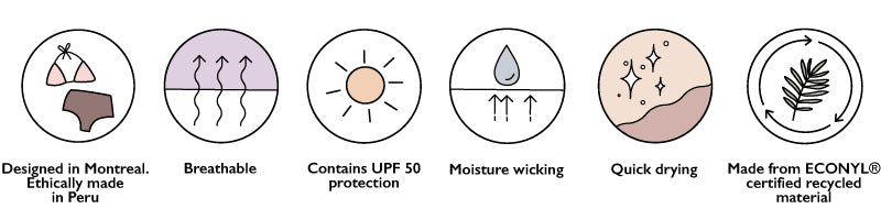 Our swimsuits are made entirely from old carpets destined for landfills, fishing nets from aquaculture, fish industry, ghost nets and pre-consumer waste. At this moment, the waste is collected in Canada (British Columbia), USA, Greece, Egypt, Pakistan, Turkey, Thailand and Norway. Our Econyl® fabric is considered one of the most eco-friendly materials because it can be endlessly recycled and regenerated infinitely without any quality loss, which reinforces our circular manufacturing process.