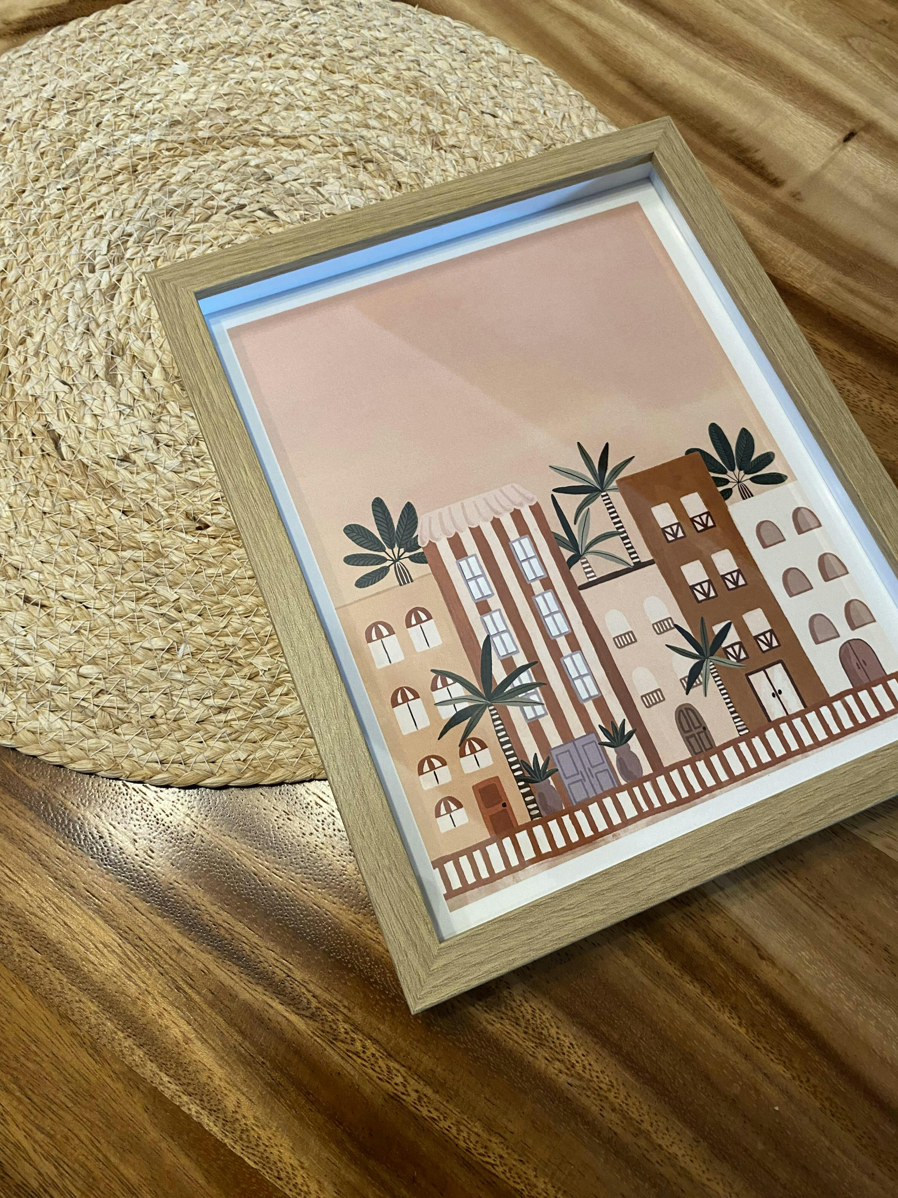 Escape in the magic with this vibrant Miami art print. Featuring a stunning cityscape at sunset, complete with colorful buildings, palm trees, and other tropical foliage. Experience the warmth and energy with our Miami Art Print every time you look at it🌴